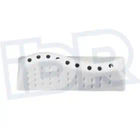 Características: Medidas largo 140mm y ancho 15/46mm. Con altura de 47mm. El material es plástico de color blanco. Número de orificios: 9.